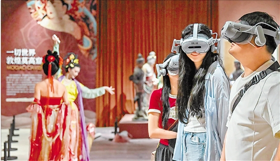 观众头戴VR设备,参观《相无古今——石窟艺术超感沉浸体验》。 本报记者 董旭明 摄