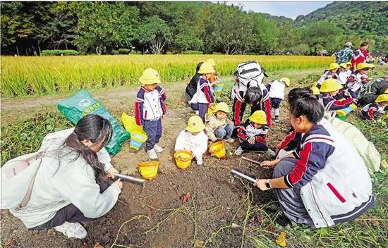 10月23日,杭州多所小学和幼儿园的孩子在老师带领下走进八卦田遗址公园秋游,体验挖番薯、刨花生、砍甘蔗等劳动。