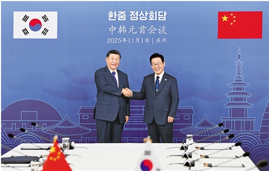 当地时间11月1日下午,韩国总统李在明同中国国家主席习近平在庆州博物馆举行会谈。 新华社记者 申宏 摄