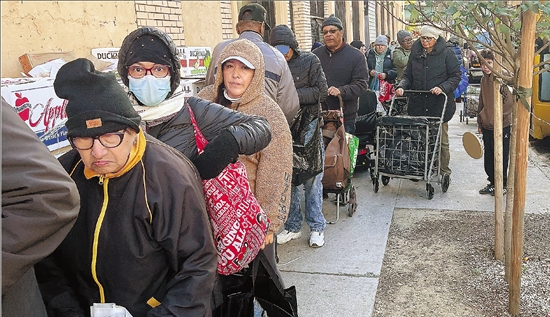当地时间2025年11月1日,美国纽约布朗克斯区,人们排队领取免费食物。 CFP供图