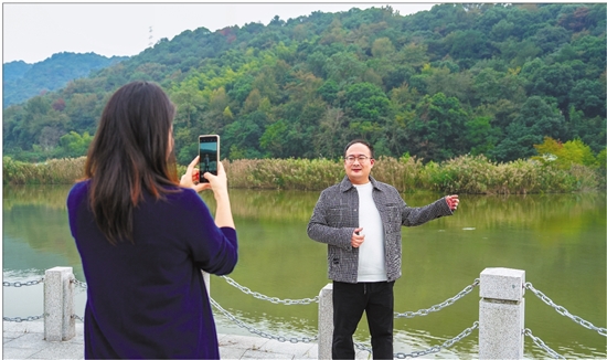 记者金燕翔(右)体验以青山绿水为背景直播。 本报记者 王啸天 摄