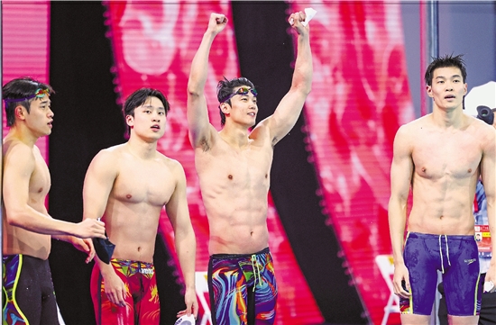 11月10日晚,全运会男子4×100米自由泳接力决赛,浙江队夺得金牌。图为浙江队队员庆祝胜利。 本报特派记者 王建龙 蒋超 董旭明 摄