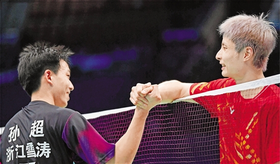 全运会羽毛球男子团体决赛,浙江队和江苏队的第一单打孙超与石宇奇赛后握手致意。孙超虽败犹荣,其超水平发挥展现了年轻一代的冲击力。