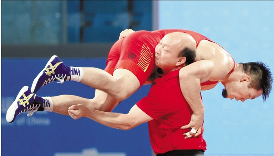 第三次参加全运会的老将袁绍华,在男子自由式摔跤65公斤级决赛中以8∶0的绝对优势成功卫冕。赛后,教练陈福勇冲上赛场,把袁绍华高高抱起摔在垫子上,这是师徒间特有的庆祝方式。