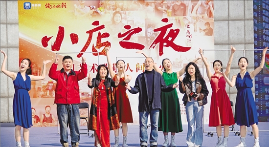 送水工王斌(左二)、理发师周巧红(左三)、摄影师曹梦琪(右三)三位小店店主与省政协委员葛继宏正在表演脱口秀《小美满》。 本报记者 杨晓轩 摄