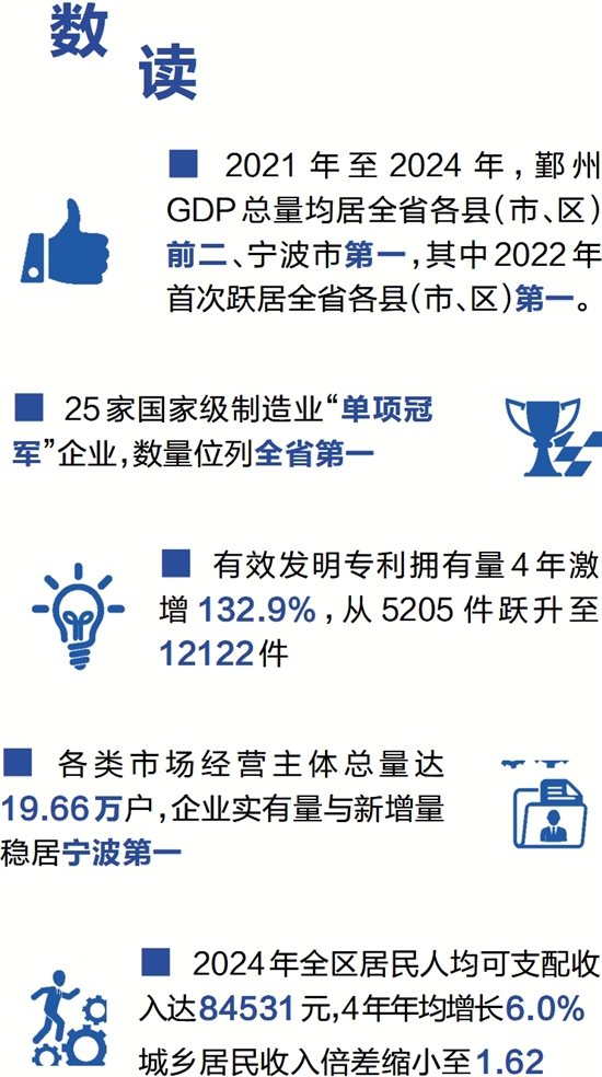 ■ 2021年至2024年,鄞州GDP总量均居全省各县(市、区)前二、宁波市第一,其中2022年首次跃居全省各县(市、区)第一。