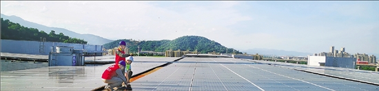 国网平阳县供电公司工作人员查看浙江一鸣食品股份有限公司厂房的屋顶光伏设备。 通讯员 潘周辉 摄
