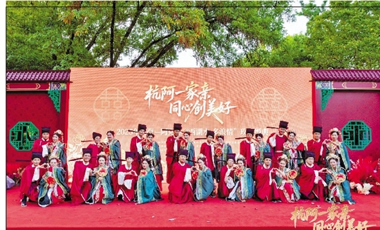 2025年8月29日,七夕节,在杭州西溪国家湿地公园,来自杭州和阿克苏市两地的新人身着华美宋制婚服,参加“西湖水·多浪情”玫瑰婚典。