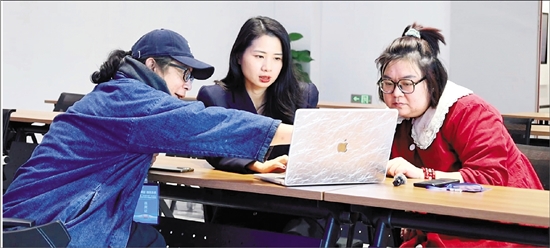 (左起)乌米、丽米、紫米正在讨论AI创作。 本报记者 刘琨 摄