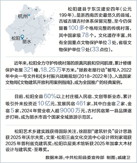 近年来,松阳全力守护传统村落的原真风貌和空间肌理,累计修缮保护老屋321幢、18.25万平方米。“拯救老屋行动”被写入2022年中央一号文件和《乡村振兴战略规划(2018-2022年)》,入选国家文物局《文物建筑开放利用案例指南》,成为全国推广的经典案例。