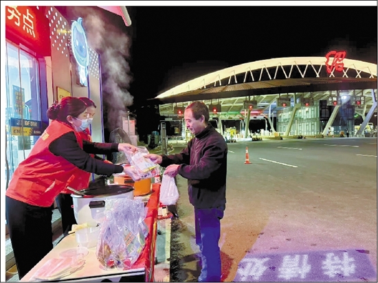 绍兴收费中心所工作人员为货车司机送上食堂自制食品