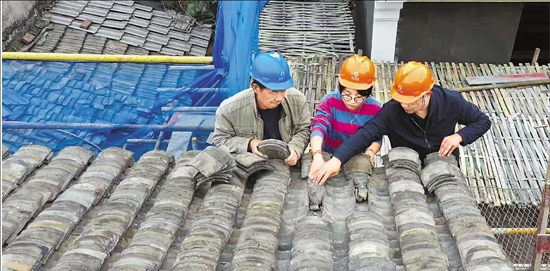 记者李文瑶(中)在老宅屋顶铺瓦片。 受访者供图