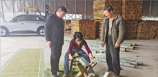 记者李文瑶(中)体验“刮竹青”。 本报记者 苗丽娜 摄
