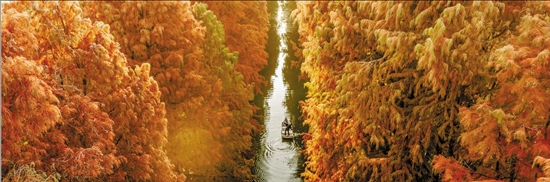 12月9日,杭州余杭良渚港南村,村子旁小河两侧整齐地排列着焦糖色的杉树,人们在夕阳的陪伴下泛舟其间。 本报记者 梁臻 摄