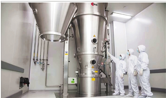 华海药业制剂生产车间内,药监局工作人员对生产线进行检查,促进企业技术革新。