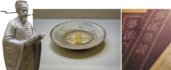 左图:中华世纪坛,沈括塑像。中图:中国国家博物馆展出的北宋水浮力指南针。据《梦溪笔谈》和《本草衍义》按1:1比例复制。右图:《梦溪笔谈》。 视觉中国供图