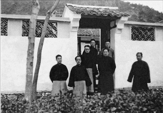 1928年,叶圣陶(左一)、胡愈之(左二)、夏丏尊(右一)等人在白马湖畔的“平屋”前留影。
