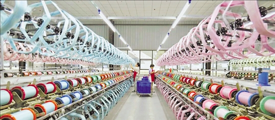 在广西忻城茧丝绸产业园项目生产车间内,工人们进行倒筒作业。 受访者供图