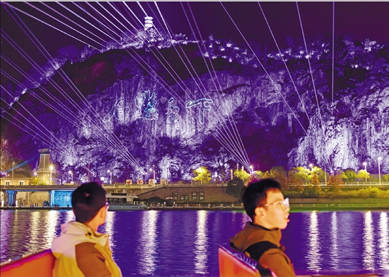 12月18日晚,游客们乘船夜游青田太鹤湖,感受侨乡的光影魅力。“夜游太鹤湖”是青田着力打造“夜经济”、培育文旅新业态的重要项目。
