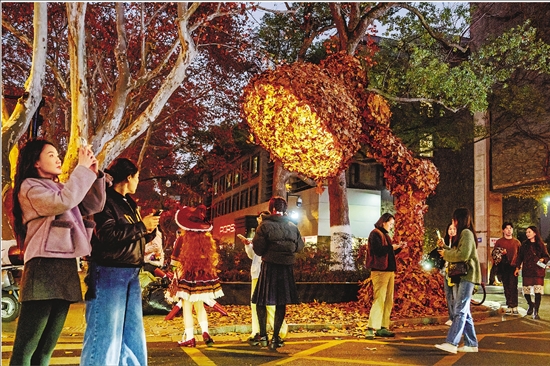 12月19日,中国美术学院第十九届秋叶艺术节在南山校区开幕。本届艺术节以“生命·无界”为主题,市民游客不仅能观赏学生制作的系列落叶艺术装置,还可以体验用落叶装点服饰。