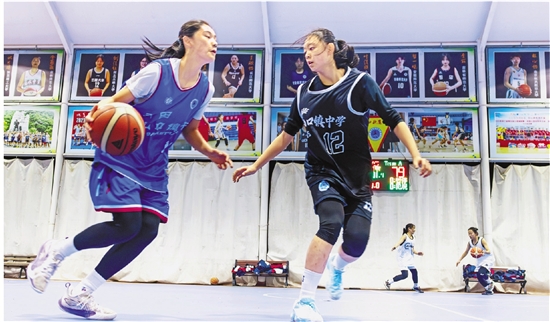 队员们在进行一对一对抗训练,背后墙上悬挂着优秀队员的照片。