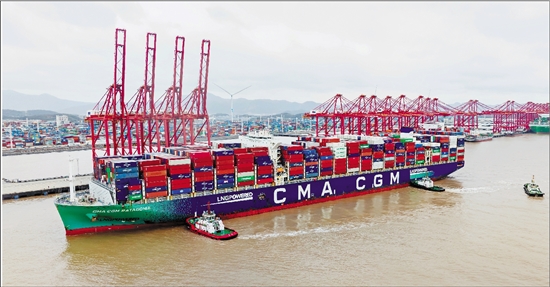 1月1日9时,在宁波舟山港梅山港区,集装箱船“达飞巴塔哥尼亚”轮缓缓靠泊至4号泊位,宁波舟山港迎来新年第一船。