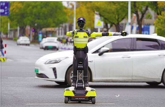 杭州市滨江区长河路与滨康路路口,实习机器人交警在进行交通引导。