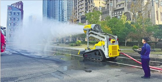 消防员李石福操控消防排烟灭火机器人。 本报记者 陆斯超 摄