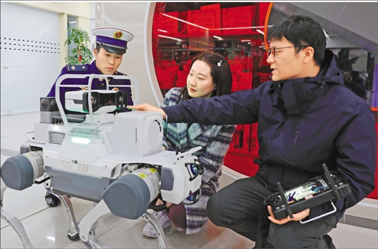 本报记者(中)跟随消防员和四足机器人一起进行商场夜间巡逻。 通讯员 宗琳玲 摄