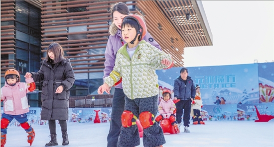 冬日,“冰雪经济”火热,德清县下渚湖·奇幻谷景区推出各类冰雪游玩项目,吸引众多市民游客前来体验。图为1月7日,游客在该景区户外冰场滑冰。 通讯员 王树成 摄