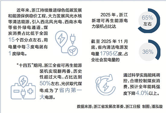 近年来,浙江持续推进绿色低碳发展和能源保供稳价工程,大力发展风光水核等清洁能源,引入西北风光电、西南水电等省外绿电通道,煤炭消费占比低于全国15个百分点左右,用电量中每3度电就有1度绿电。
