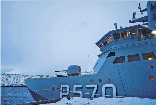 当地时间1月17日,丹麦皇家海军“克努兹·拉斯穆森”号军舰停靠在格陵兰岛首府努克的港口。 CFP供图