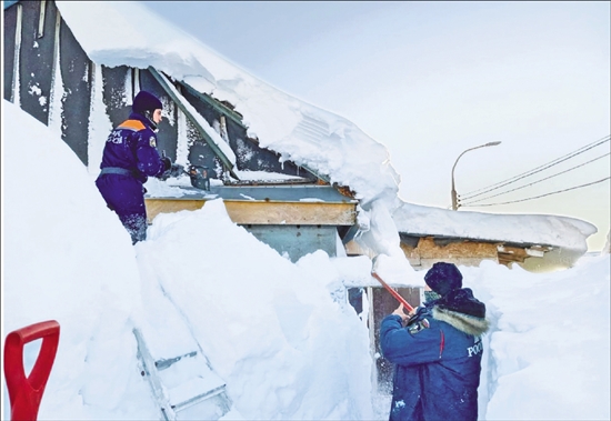 1月19日,在俄罗斯堪察加边疆区首府堪察加彼得罗巴甫洛夫斯克市,工作人员在清理积雪。 新华社发(俄罗斯堪察加边疆区政府供图)