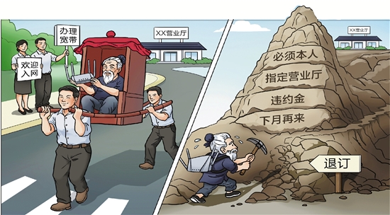 如今,家庭宽带退订成了新版“愚公移山”,办时是“闪电战”,退时成“持久战”。人为设卡、信息不透明,实则是将管理成本转嫁给用户,侵犯公平交易权。莫让“退订难”挖断信任之山,运营商当以畅通无阻的“退路”,重塑以用户为本的数字生态。 陈昱志 金妍 作 |
