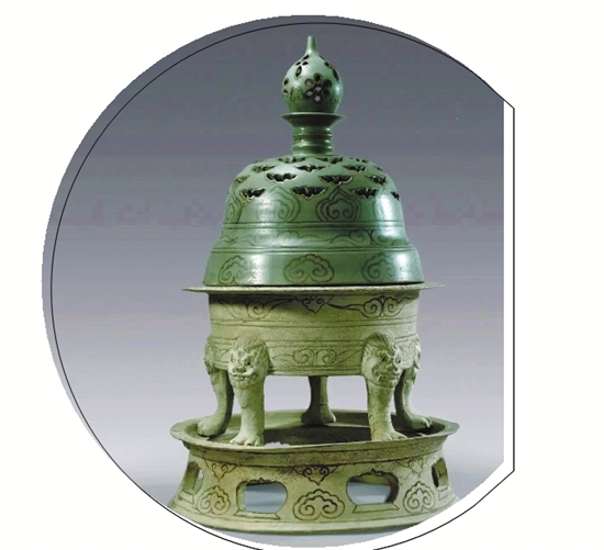 唐秘色瓷青釉褐彩带座瓷熏炉,杭州吴越文化博物馆藏。
