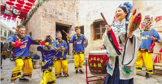 2月5日,在温岭市石塘镇里箬村,来自埃及的努兰头戴簪花,沉浸式参与大奏鼓表演,感受中国的民俗。当天,为期4天的温岭首个簪花主题市集在这里开幕。 通讯员 孙金标 摄