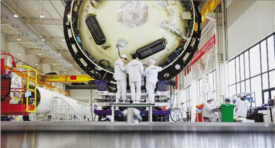 总装车间内,装配人员正在检测朱雀三号二级管线。