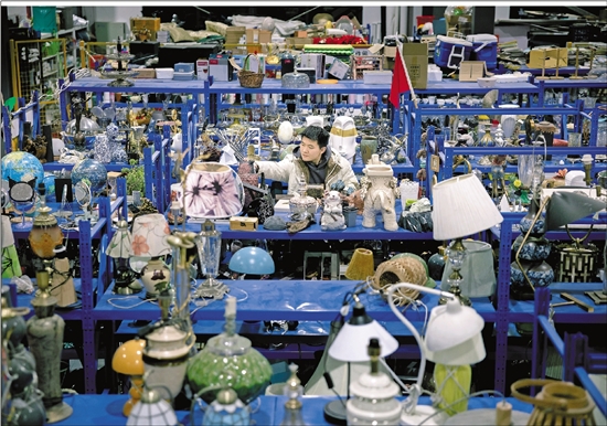 道具房中工作人员正在货架上挑选下一场戏所需的道具。