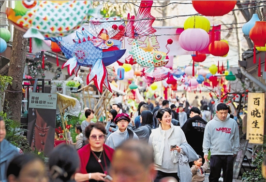 2月15日,杭州小河直街悬挂起五彩斑斓的灯笼,吉祥装饰遍布街边商铺,处处散发着浓浓的年味。 本报记者 林云龙 摄