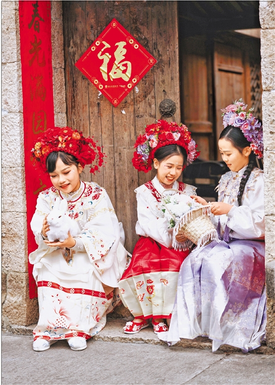2月14日,温岭市石塘镇里箬村,游客身着传统民俗服饰、头戴精美簪花,漫步在百年石屋古巷间拍照打卡,解锁别样新春文旅乐趣。 本报记者 朱海伟 通讯员 陈衍初 摄