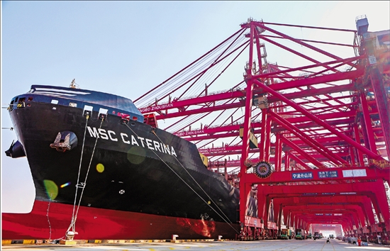 “地中海·卡泰丽娜”轮正在装载集装箱。 通讯员 姜怡 摄