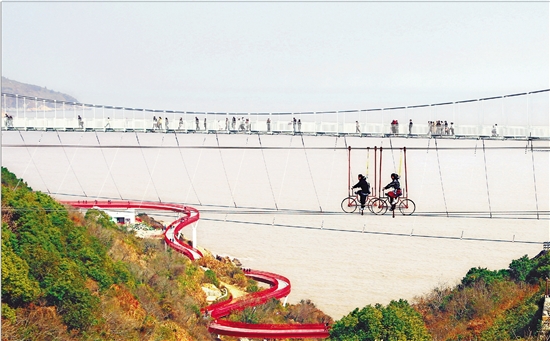 2月19日,在玉环市干江镇上栈头村景区,游客正在体验高空自行车项目,享受新春佳节的美好时光。