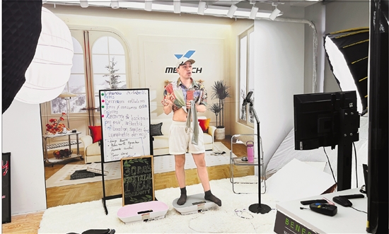 浙江麦瑞克科技有限公司的直播间内,外籍主播正在沉浸式演示产品。 本报记者 周林怡 摄