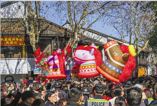 2月21日,杭州南宋御街上锣鼓喧天,热闹非凡。杭州市文化广电旅游局推出“宋福杭州年——跟着《太平年》游杭州”集章打卡活动,带领市民游客在行走中感受历史底蕴与节庆氛围。 本报记者 董旭明 摄