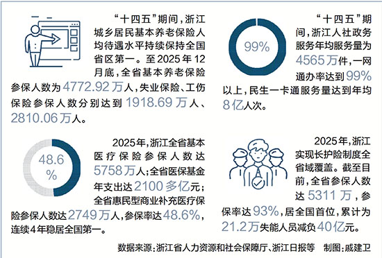 “十四五”期间,浙江城乡居民基本养老保险人均待遇水平持续保持全国省区第一。至2025年12月底,全省基本养老保险参保人数为4772.92万人,失业保险、工伤保险参保人数分别达到1918.69万人、2810.06万人。
