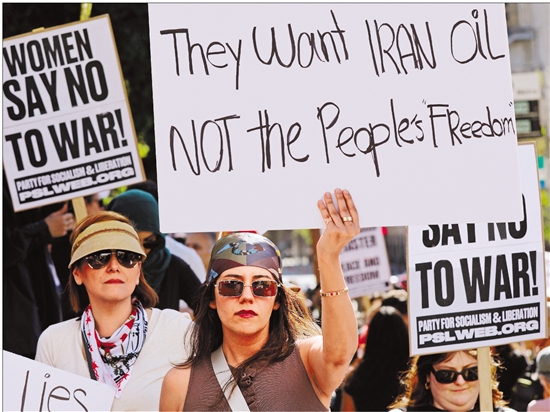 3月7日,在美国加利福尼亚州洛杉矶市政厅前,人们参加集会,抗议美国和以色列对伊朗发动军事打击。 新华社发(邱晨摄)