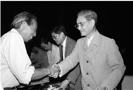 1991年6月26日,中共中央组织部、中共中央宣传部等单位在北京召开大会,表彰全国高校优秀思想政治工作者。这是宋平同志(右)向获奖的个人颁奖。