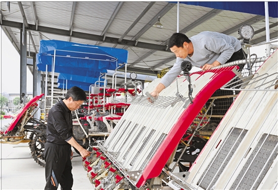 3月19日,在松阳县共富农事服务中心,工作人员在检修农机。