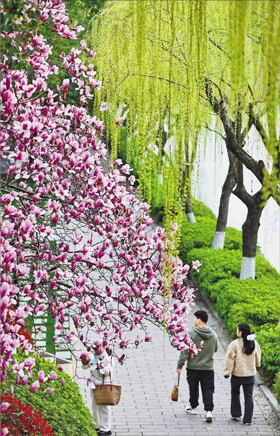 3月19日,嘉兴市南湖景区花红柳绿,春意盎然,吸引众多游客前来游览观光。