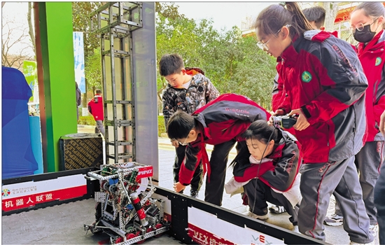2025年12月,杭州市学军中学VEX战队成员在杭州市中小学生科技节,向现场中小学生开展机器人教学展示,并组织实践对抗体验。 受访者供图